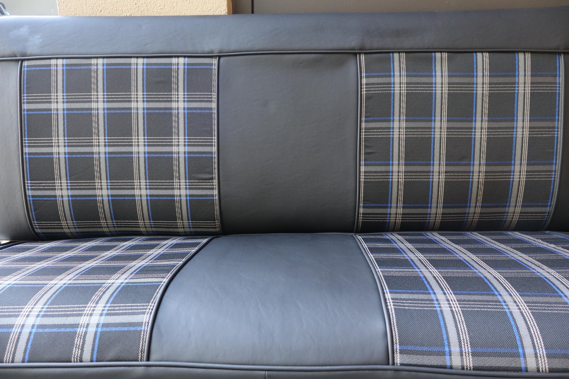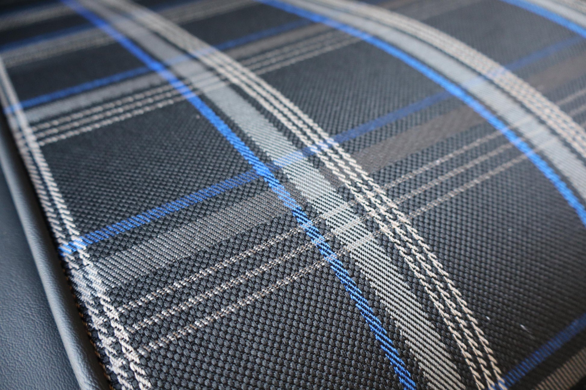 Carrara Black Premium vinyl and Plaid Black and Blue twined fabric